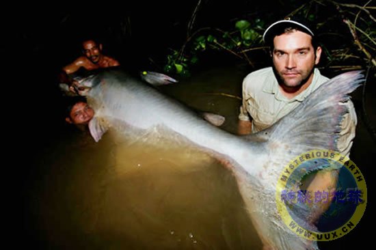 Biologist Zeb Hogan holds the tail of a Mekong giant catfish captured and released on November 13, 2007, in the Tonle Sap River in Cambodia.