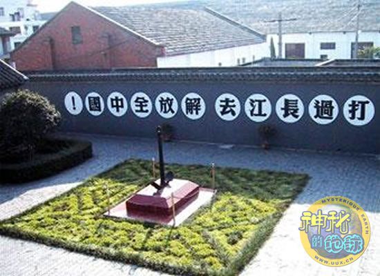 推开古色古香的黑漆大门,一栋清式的两层小楼出现在面前,和一般的地主庄园没什么两样,小楼上的雕梁画栋非常精致,只是院子内的大铁锚雕塑和围墙上的标语,提醒观者这座小楼的非凡之处。标语上书“打过长江去解放全中国!”几个白底黑字很是醒目。