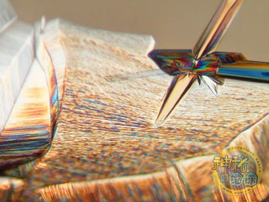 本图是采用光学显微镜拍摄下来的晶体成长的过程。当硫酸镁溶液冷却时,于是就形成了泻利盐晶体和六水泻盐晶体。硫酸盐矿物是金属元素阳离子和硫酸根相化合而成的盐类。由于硫是一种变价元素,在自然界它可以呈不同的价态形成不同的矿物。由于大多数硫酸盐晶体都含有水,使得其最突出的物理性质就是硬度低,一般在2至3.5之间。另外,这种晶体的颜色一般为无色或者白色,比重一般也不大。硫酸盐矿物的形成需要有氧浓度大和低温的条件,因此地表部分是最适宜于形成硫酸盐矿物的地方。在此类矿物中,外生成因远比内生成因显得更为重要。