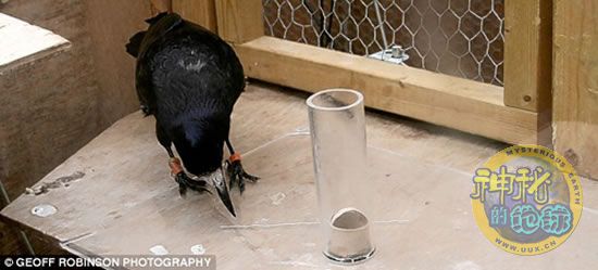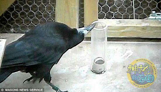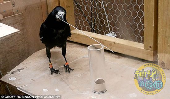 试验期间,研究人员给它们提供了一个小桶,一个长玻璃管,小桶放在玻璃管底,虫子在小桶里蜿蜒爬行,乌鸦够不到它们。在玻璃管旁边放着一根细铁丝。尽管它们以前从没有过这种经历,但是这些聪明的乌鸦看一眼后似乎立刻就想出了吃到虫子的办法,它们开始忙着把铁丝弄弯,让它形成钩状,然后用钩子把小篮子勾出来,尽情享用美餐。