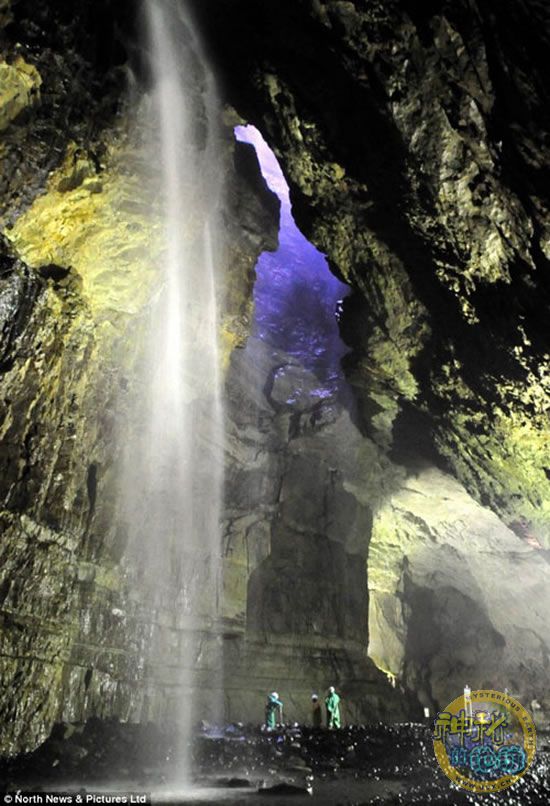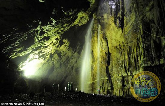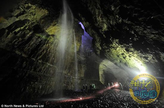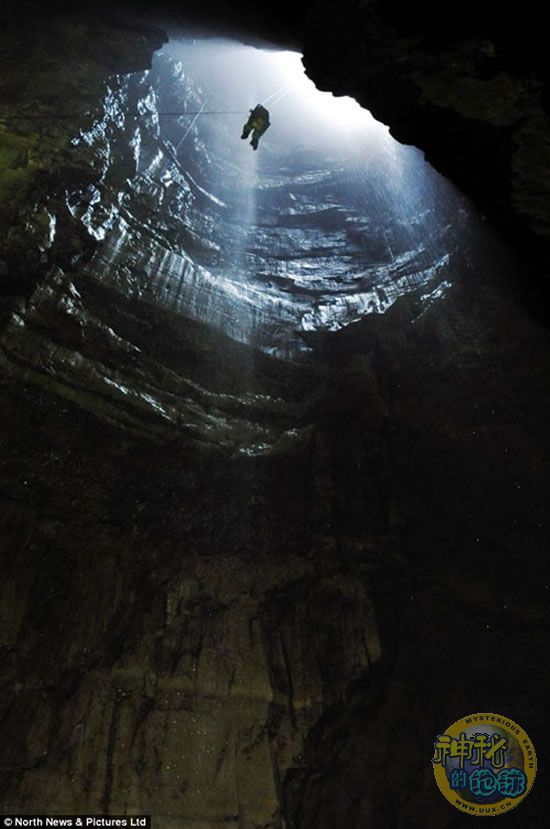 洞穴爱好者在泛光灯照亮下,拍下了英国已知的最大洞穴的照片,从而让大家能一睹此神秘洞穴的真面目。他们从此洞口沿着绳索像蜘蛛人似的一个接一个地伸入到此洞下黑暗的深渊中,从而拍下了一组令人惊讶的洞穴照片。此名为“加平-吉尔(Gaping Gill)”的洞穴上周末对公众开放,洞穴爱好者才有幸探测此壮观洞穴。他们发现此洞穴如此之大,足可以装下整个约克大教堂,这可是英国最大的哥德式教堂。