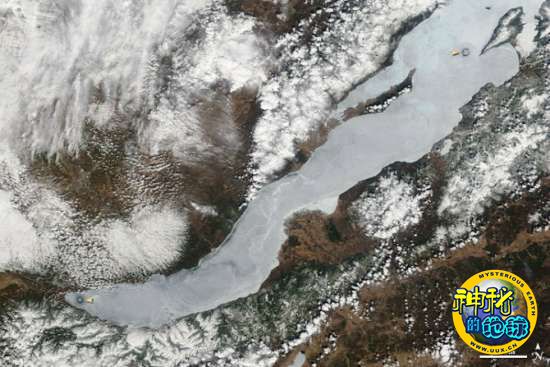 这是美国宇航局中分辨率成像光谱仪(MODIS)拍摄的照片,从中我们可以看到贝加尔冰面巨大的黑色圆圈。
