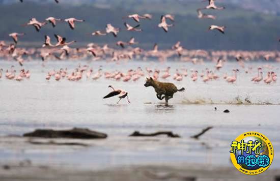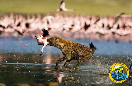 鬣狗是一种强悍的中型猛兽,它们集体猎食瞪羚、斑马、角马等大中型草食动物,甚至可以杀死半吨重的非洲野水牛。鬣狗犬齿、裂齿发达,咬力强,是惟一能够嚼食骨头的哺乳动物。它们的感觉器官十分敏锐,尤其是它们的嗅觉和听觉。鬣狗通常会在早晨对火烈鸟群发动攻击。早晨大量火烈鸟聚集在湖畔饮水。能够迅速逃离湖畔并飞上天空的火烈鸟能够免于捕食,而那些体弱行动迟缓的火烈鸟往往就会被捕杀。捕捉到这一系列鬣狗捕食火烈鸟的镜头非常震撼,尤其是因为镜头离火烈鸟群很近,你可以更真切地感受到,火烈鸟的惊慌、恐惧。