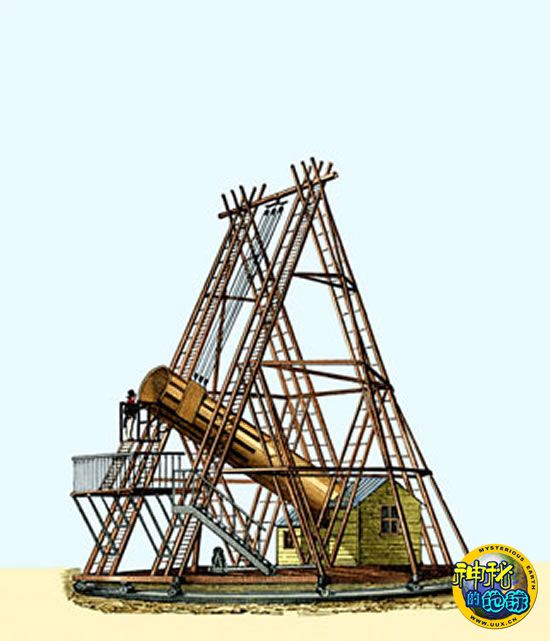 18世纪晚期,德国音乐师和天文学家威廉-赫歇尔开始制造大型反射式望远镜。图中显示的是赫歇尔所制造的最大望远镜,镜面口径为1.2米。该望远镜非常笨重,需要四个人来操作。赫歇尔是制作反射式望远镜的大师,他早年为音乐师,因为爱好天文,从1773年开始磨制望远镜,一生中制作的望远镜达数百架。赫歇尔制作的望远镜是把物镜斜放在镜筒中,它使平行光经反射后汇聚于镜筒的一侧。在反射式望远镜发明后,反射材料一直是其发展的障碍:铸镜用的青铜易于腐蚀,不得不定期抛光,需要耗费大量财力和时间,而耐腐蚀性好的金属,比青铜密度高且十分昂贵。