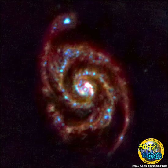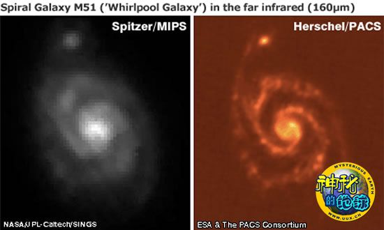 “赫歇尔”望远镜造价10亿欧元,于5月14日发射升空,使命是研究恒星和星系的形成以及在宇宙时期的发展变化。6月14日,地面任务控制中心发送指令,命令“赫歇尔”打开用于保护敏感仪器免遭污染的舱门,于是,这个世界上最大的远红外太空望远镜“睁开了眼睛”。“赫歇尔”望远镜利用光电阵列和射谱仪(PACS)对涡旋星系(亦称M51)进行了探测。